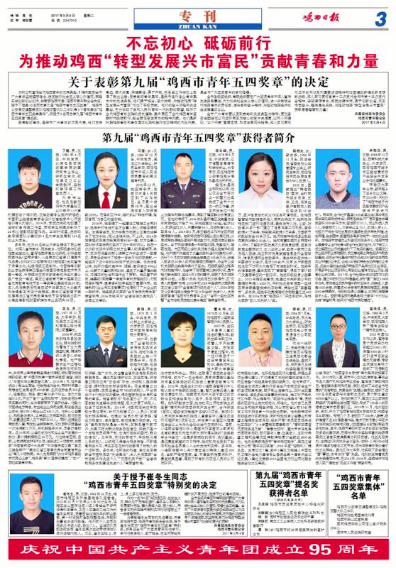 5月9日上午,鸡西团市委“纪念建团95周年先优表彰暨优秀青年事迹报告会”在政府会堂隆重召开,鸡西市人大、市委、市政府、市政协领导出席大会。小海豚启智培训中心董永坤老师喜获“鸡西市青年五四奖章”,这一奖项是共青团鸡西市委、鸡西市青年联合会授予我市青年和青年集体的最高荣誉。
