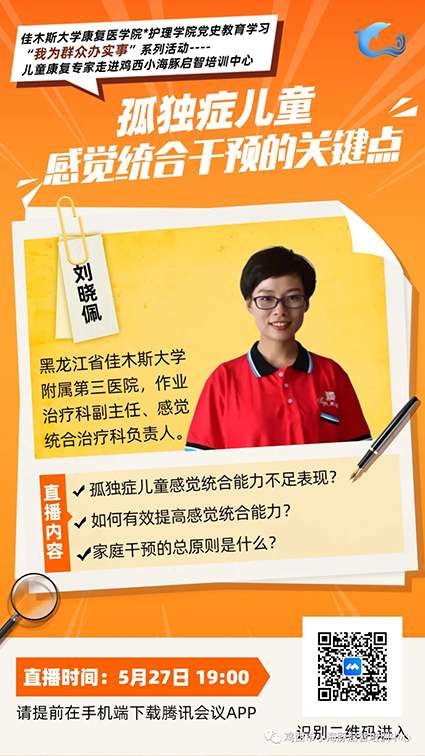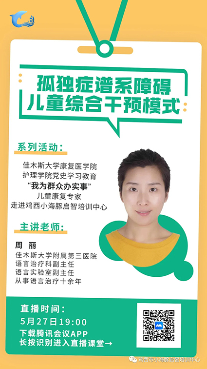 在“六一”国际儿童节来临之际,5月27日晚,佳木斯大学康复医学院护理学院党史学习教育“我为群众办实事”系列活动——儿童康复专家走进鸡西市小海豚启智培训中心,通过线上“云课堂”的方式如约开展。