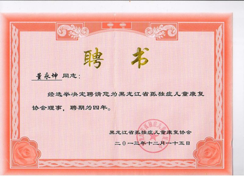 2013年12月15日下午,黑龙江省孤独症儿童康复协会召开第二届会员代表大会。会上,总结了协会成立五年来的工作,选举产生了新一届理事会,鸡西市小海豚启智培训中心董永坤老师成功当选为新一届理事会理事。董永坤老师表示:感谢省孤独症儿童康复协会的信任和支持,我将继续加强与省孤独症儿童康复协会、哈医大公卫学院少儿卫生教研室、佳木斯大学康复医学院、佳木斯大学附属第三医院的协作,努力为孤独症儿童的康复事业发展做出新的、更大贡献。
